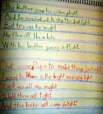 J's free drawing from the story -- he's got the whole family there, outside one of the houses in town -- there's the sisters fighting and biting, the brothers taking flight like a kite, Mom lying down and looking white, and Papa with the baby, getting ready to set everything right.